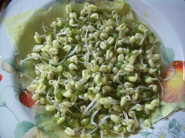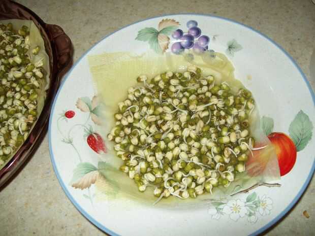 Tamizar a través y enjuagar los granos antes de usarlos! Coloque una toalla de papel húmeda en el fondo de un plato y los granos en una sola capa. Brotes como húmedos lugares oscuros, así que coloque algo sobre el tazón de fuente (usé chop sticks y atravesado ellos) y una toalla en el recipiente para mantener los brotes en la oscuridad - o colocarlos en un armario.