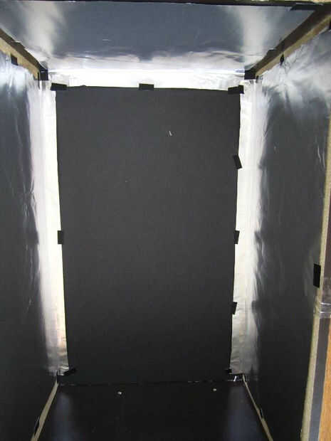 después de esto, puede pintar el interior blanco o cubrir las paredes con papel de aluminio resistente. NO doblar y crear líneas en la hoja. Esto brillará la luz de forma muy desigual. clase resistente es muy difícil de extraer y se mantiene plana muy fácilmente... PERO si se puede, usted debe elegir pintar en lugar de la hoja. pintura blanca simplemente es hasta un 90% reflectante en tal situación. pintura también durará más tiempo, donde la lámina puede rasgar y tienen que volver a colocar.