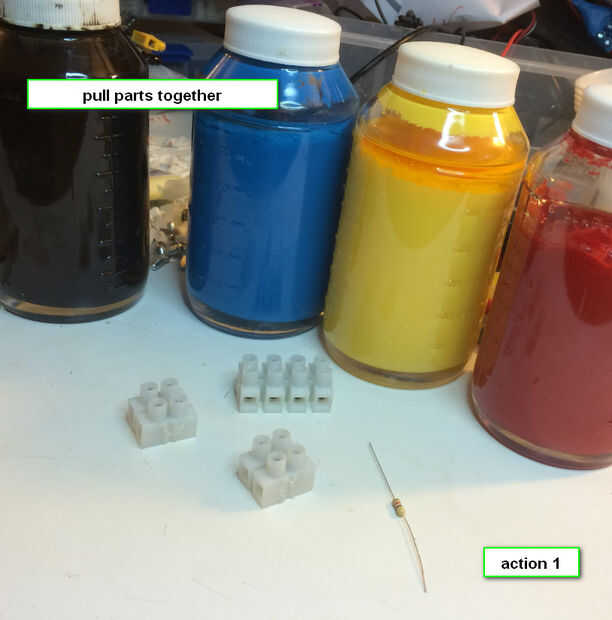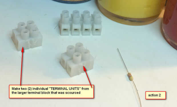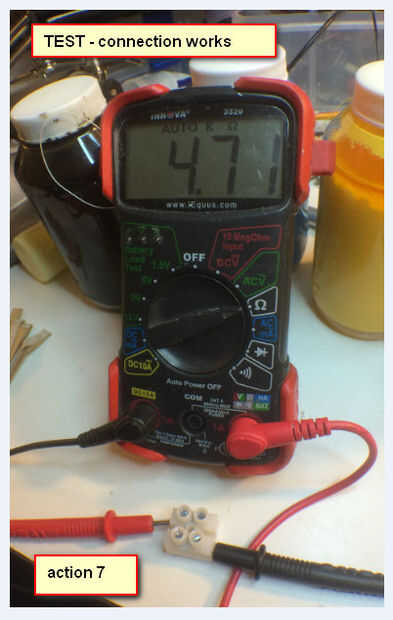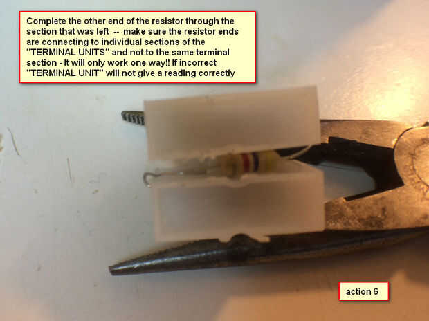 Completar el otro extremo de la resistencia a través de la sección que quedaba--Asegúrese de que los extremos de la resistencia se conectan a las secciones individuales de las "unidades terminales" y no a la misma sección terminal - sólo funcionará una manera!! Si incorrecto "unidad TERMINAL" no dará una lectura correctamente.