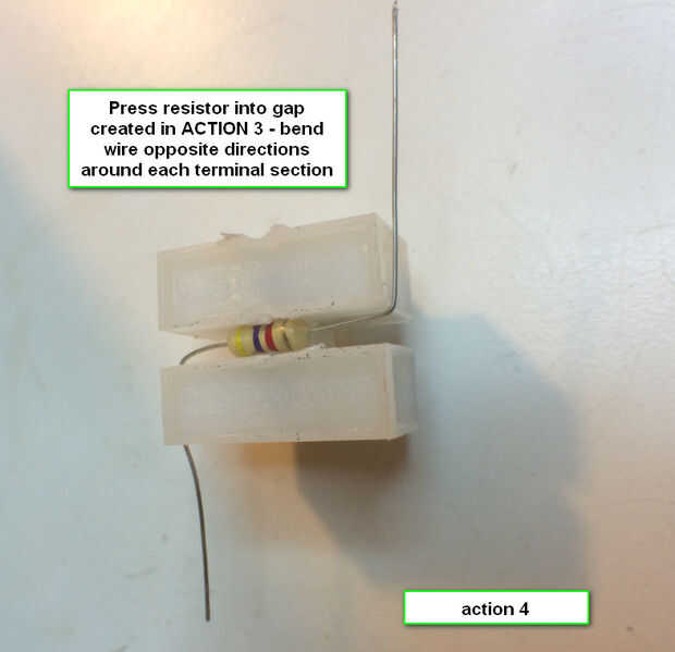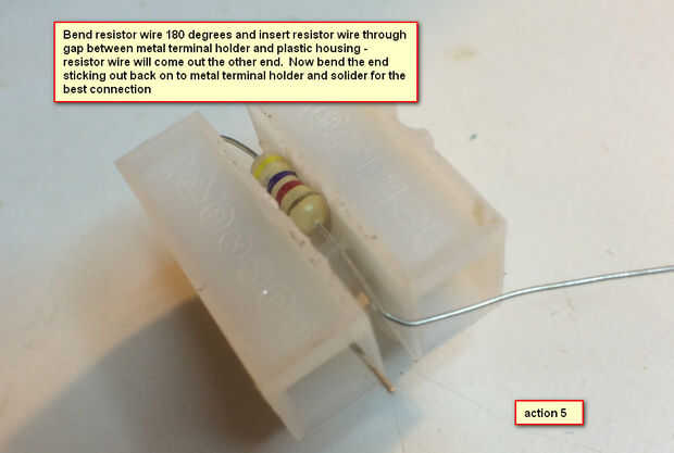 Doble resistencia cable 180 grados e inserte el alambre de la resistencia a través de la brecha entre soporte terminal metálico y carcasa de plástico, alambre de la resistencia va a salir el otro extremo. Ahora doble el extremo sobresale detrás en metal soporte terminal y soldado para la mejor conexión