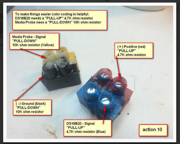 DS18B20 necesita una "Pull-up" K 4,7 ohm resistencia Media sondeo necesita un resistor de "PULL-DOWN" 10K ohm.