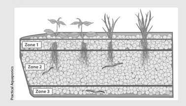Mayor actividad de crecimiento y de la planta de raíz se producirá en la zona próxima de aproximadamente 150 - 200 mm – en esta zona, durante la parte del drenaje de la inundación y ciclo de drenaje, el agua drena lejos totalmente, lo que permite entrega excelente y muy eficiente de aire rico de oxígeno a las raíces, las bacterias beneficiosas, los microbios del suelo, y el residente de la tierra/compost gusanos. Durante la parte de la inundación del ciclo, el agua entrante distribuye humedad, nutrientes y entrantes pescado sólido residuos partículas a lo largo de la zona de crecimiento. La población del gusano hace la mayor parte de su trabajo muy importante en esta zona, rompiendo y reducción de materia sólida y así liberar nutrientes y minerales en el sistema.