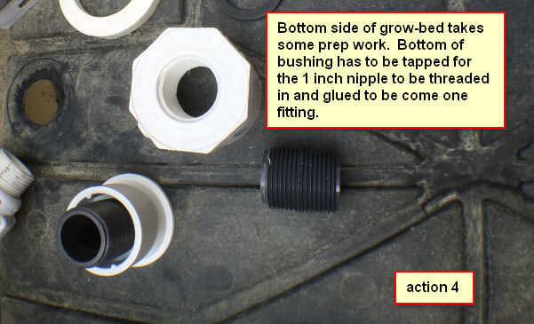 Parte inferior del accesorio de cama crecer. Este adaptador se compone de un 1 1/2 pulgada a 1 pulgada buje y 1 pulgada X 2 niple de nch. Así que es un trabajo de preparación para estar listo para ser utilizado. El pezón debe ser roscado en la parte posterior de 1 1/2 buje. Problema es que la parte inferior buje de 1 1/2 no permitirá que esto se realice como se moldea mal el pezón ser roscado en. El buje debe ser archivado por tierra hacia abajo y grabados con un grifo de 1 pulgada para permitir que el pezón a enhebrarse en y pegado así un lazo apretado y seguro se hace así el armado funciona como una conexión única.