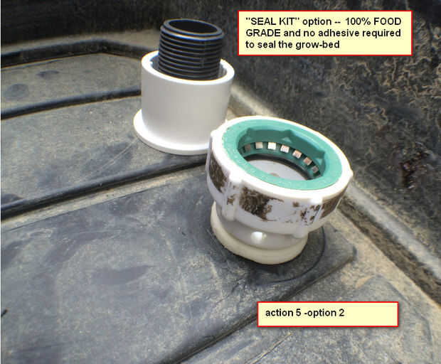 Si se utiliza la opción 2 un segundo sello de grado de alimentos 100% silicona se coloca en el extremo roscado del accesorio PVC cerradura en la parte inferior de la cama de crecimiento, así como dentro del lado de la cama crece. Apriete a mano el casquillo para el PVC Lock 1 1/2 y pondrán el sello de la conexión