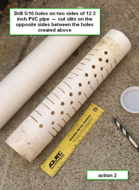 Perfore agujeros de 5/16 en dos lados de 12 tubos de PVC de 2 pulgadas--corte ranuras en los lados opuestos entre los agujeros creados anteriormente.