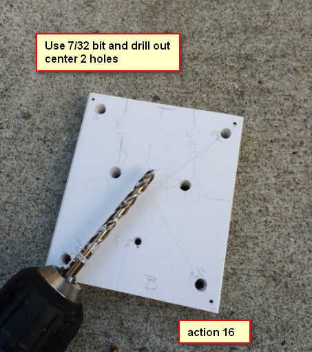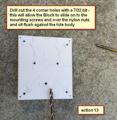 Perfore los 4 orificios de esquina con un 7/32 bit: Esto permitirá que el bloque se deslice a los tornillos de montaje y sobre el nylon tuercas y sentarse al ras contra el cuerpo de la bolsa.