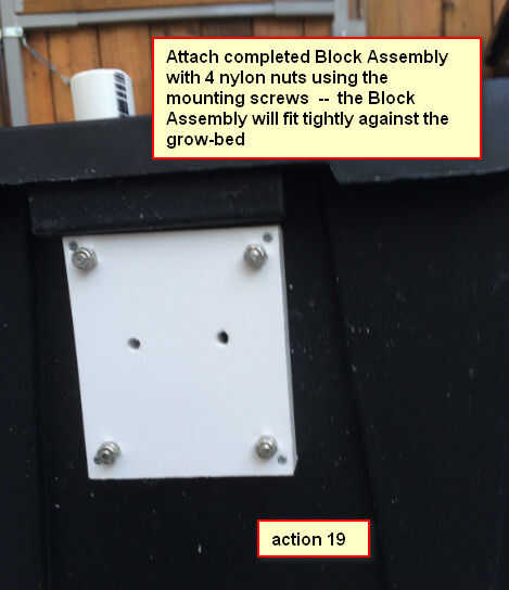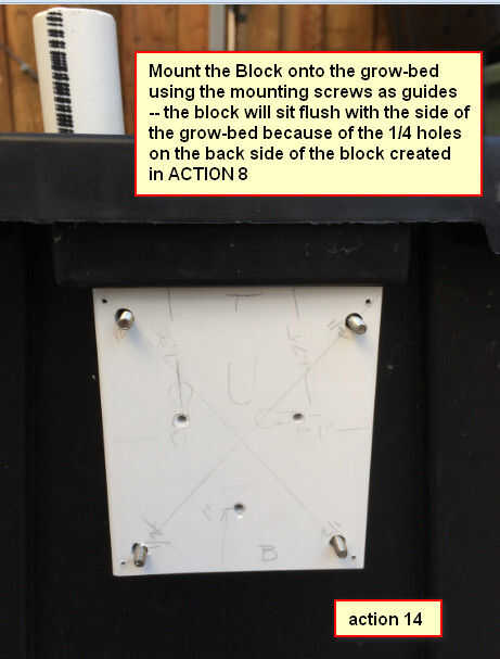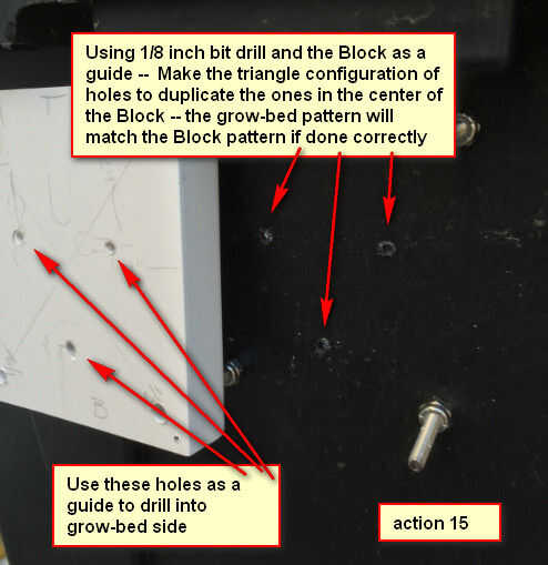 Monte el bloque en la cama de crecimiento utilizando los tornillos de montaje de guías, el bloque va a quedar al ras con el lado de la cama crece debido a los agujeros de 1/4 en la parte posterior del bloque creado en acción 8
