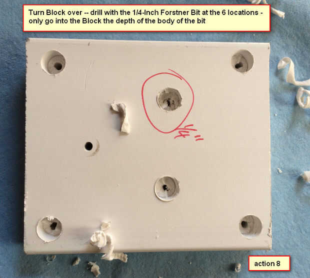 Bloque de vuelta--taladro con la broca Forstner en los 6 lugares 1/4 de pulgada - ir sólo en el bloque de la profundidad del cuerpo de la broca.