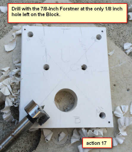 Taladro con 7/8-Inch Forstner en la izquierda de agujero único de 1/8 de pulgada en el bloque.