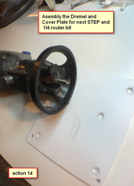 Operario de montaje la Dremel y placa de la cubierta para el paso siguiente y router de 1/4 poco.