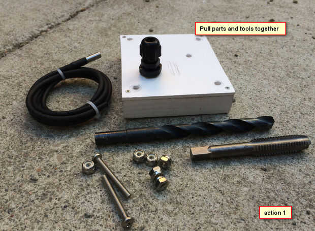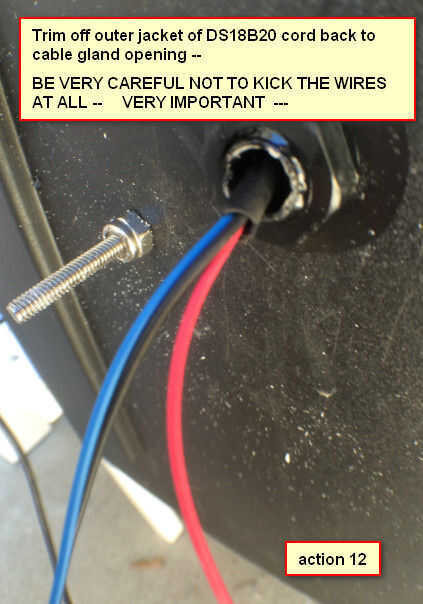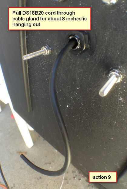 DS18B20 cordón a través de la glándula de cable para cerca de 8 pulgadas está colgando hacia fuera.