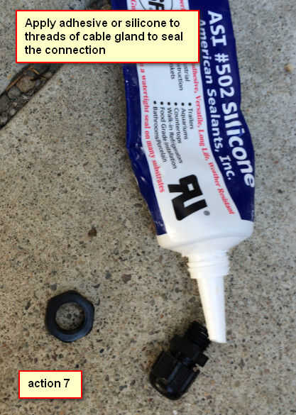 Aplicar pegamento o silicona a la rosca de prensaestopas para sellar la conexión.