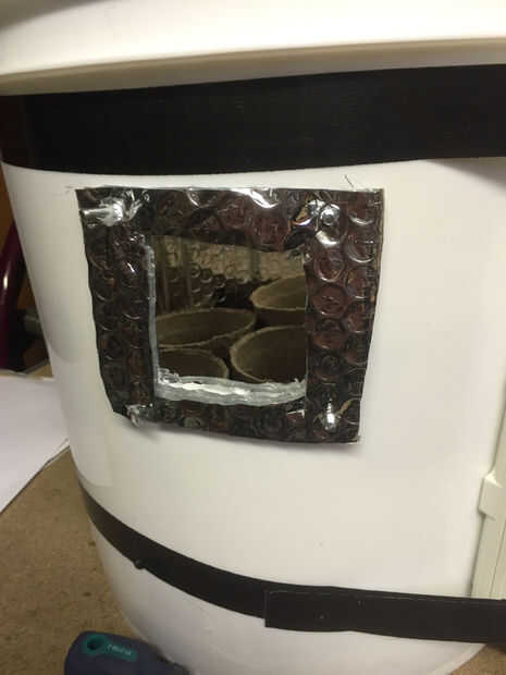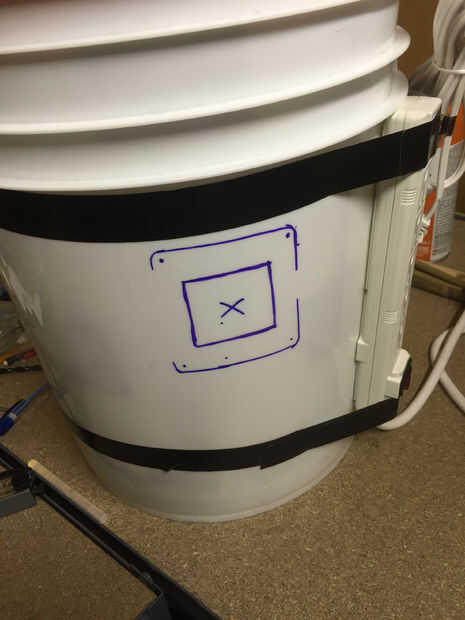 Después de haber conectado el ventilador correctamente se puede instalar a la cuchara a medio camino encima del lado. Usé un marcador para marcar la zona que quería cortar el flujo de aire y perforaciones. Luego usé un trozo extra de protector de parabrisas para crear un empaque hermético alrededor de la abertura.