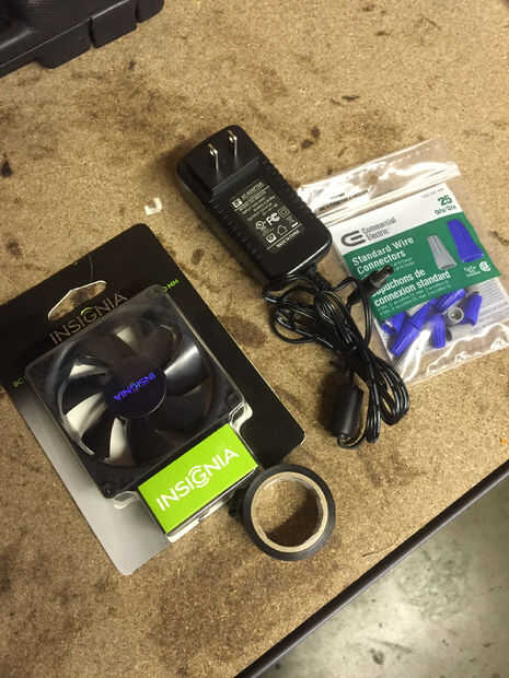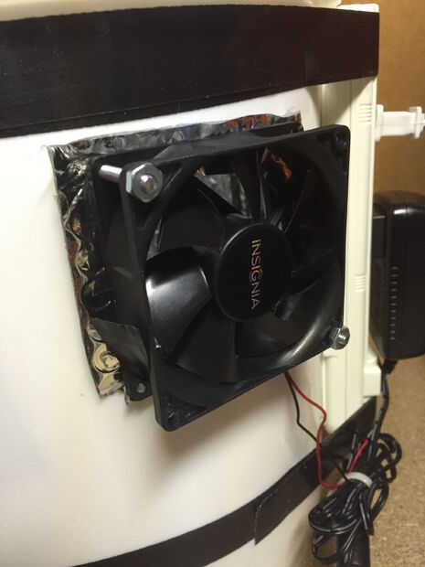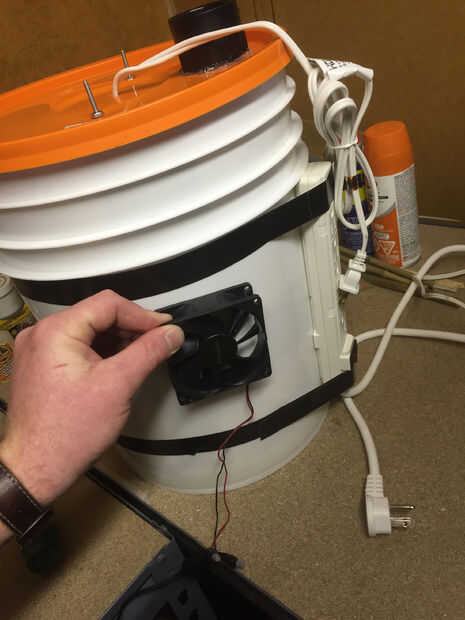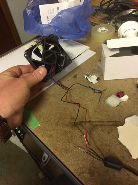 Para alimentar el ventilador que utiliza un adaptador de pared de 12v que también compré en una tienda de suministro de equipo. Corte el conector de barril que acompañaba y conectado al ventilador, asegurándose de que todo el cableado es correcto y prueba la conexión antes de instalar el ventilador. Asegúrese de que saber qué manera sopla el aire para asegurar el ventilador no es accidentalmente quitar aire del cubo crece en lugar de proporcionar ventilación.