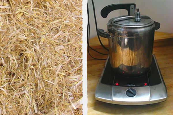 Mientras que yo he usado un montón de sustratos, incluyendo astillas y granos de café, el carbón basado en comida de micelio o "sustrato" que suelen utilizar es paja. La paja es un producto de desecho disponible muy asequible en forma de bala en tiendas de alimentación y pistas de carrera. Picar alguna paja en trozos pequeños, cubrir con agua y esterilizar en una olla a presión durante una hora. Una vez que la olla a presión es lo suficientemente fría como para abrir, lavarse las manos, limpiar todos trabajan superficies e instrumentos con alcohol isopropílico y drenan la paja en un colador limpio. Enfríe a 75 grados y usarlo inmediatamente para reducir las posibilidades de exposición de las bacterias.