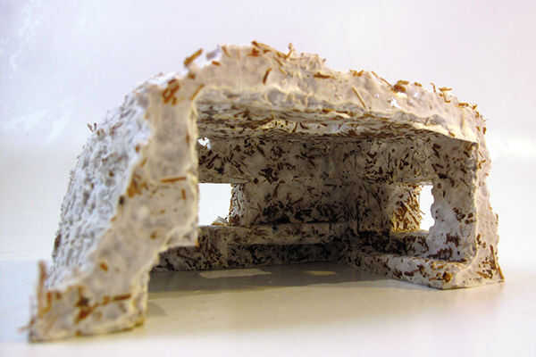 Una vez que la modelo parece suficientemente cubierto de una alfombra blanca, puede detener el proceso de crecimiento. En este punto no necesita preocuparse por contaminación, por lo que sólo puede cortar abierto la bolsa de plástico y retirar el formulario. Porque el micelio está húmedo aún es bastante frágil, lo removemos con mucho cuidado.