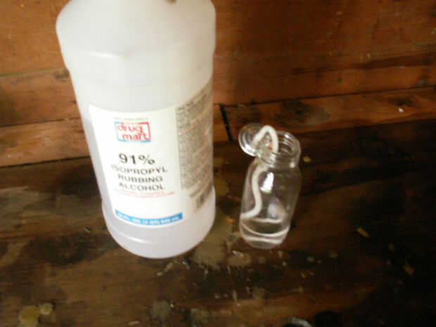 6. Llene la botella de cristal con im líquidos inflamables signo 92% frotando alcohol, hilo de rosca de la mecha por el agujero de la arandela y la tapa de la botella. y lo de la luz. (se tarda unos 10 minutos para calentar hasta la temperatura correcta)
