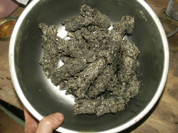 Ahora se verá un largo secado "turd girasol" por falta de una palabra mejor. Esto es bueno para alimento animal o fertilizante. El aceite sale negro, esto se resolverá en dos semanas.