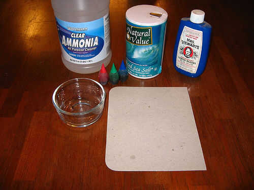 El azulado es el elemento más difícil de encontrar pero se puede encontrar en la sección Limpieza de muchas tiendas de comestibles. Usted puede encontrar el amoníaco cerca por.