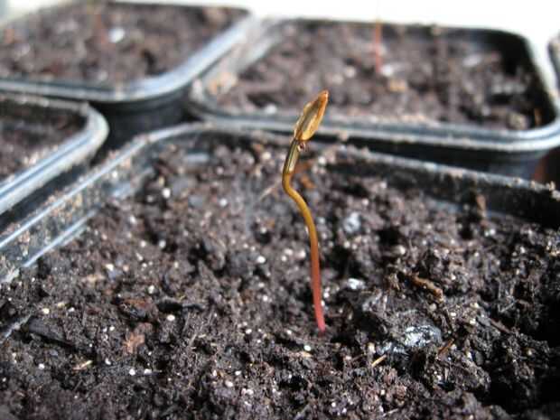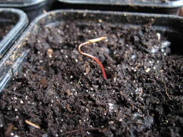 La madre de sus plántulas debe hacer pronto un forma de U al revés rojo. La envoltura de la semilla poco a poco se levantan y caen cuando los primeros cotiledones comienzan a crecer.