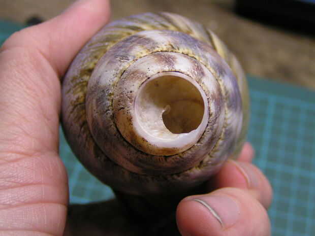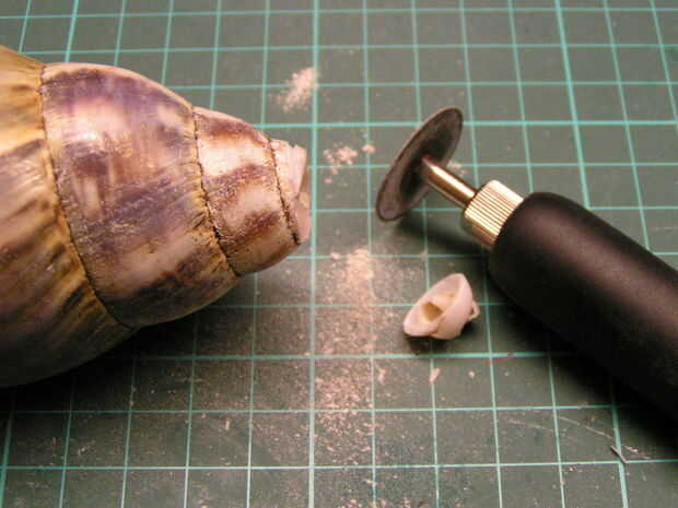 Tómatelo con calma y empezar en una de las ranuras en la espiral de la concha (es más fino allí), pero tenga cuidado de no seguir la espiral - necesita cortar a través de la cáscara para hacer un final circular. Si no está seguro de cuánto hacer el agujero, empezar con poco y ampliarla más adelante (es difícil hacerlo al revés!).
