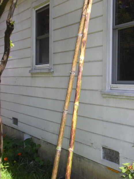 -Es mejor usar bambú seco. (Por falta de tiempo, utilicé verde). Hay desacuerdo sobre si se seca más rápido verticalmente de pie o acostado horizontal. Si se seca demasiado rápido y permanecer en el tiempo y el calor del sol, eventualmente agrietará longitudinalmente. He tenido buena suerte con la mina sequedad en mi garaje.