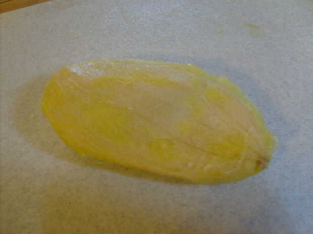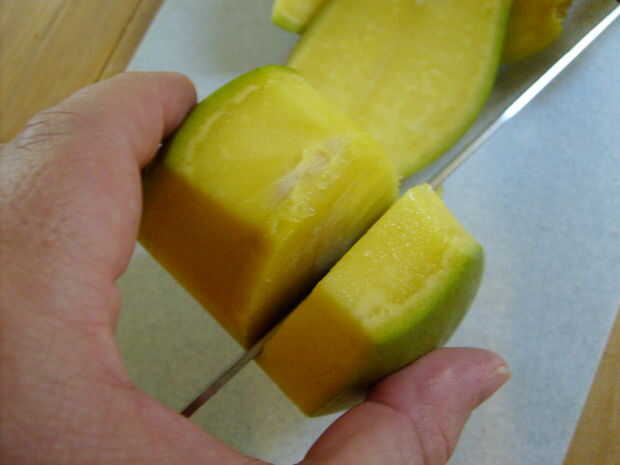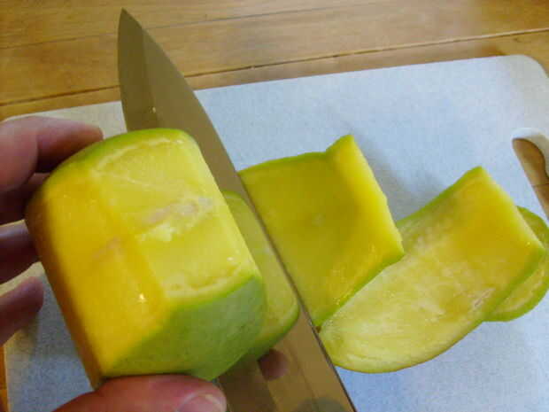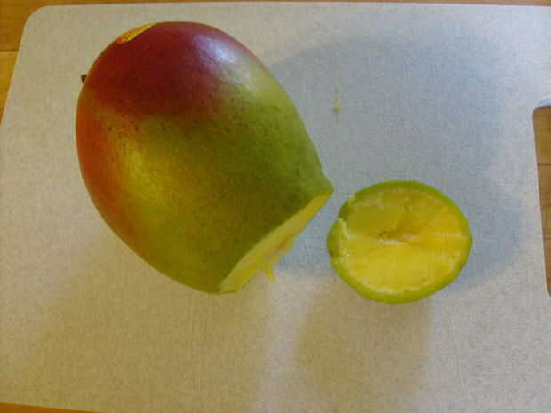 estoy seguro de que hay cien formas de cortar un mango - las fotos muestran mi método preferido - pero todo lo que consigue el hoyo de los trabajos del mediados por ahora.  Uno es el pozo, obtener tanto de la carne del mango fuera posible.  Me parece más fácil raspar con un cuchillo suavemente y enjuague regularmente.