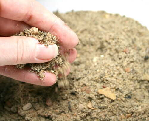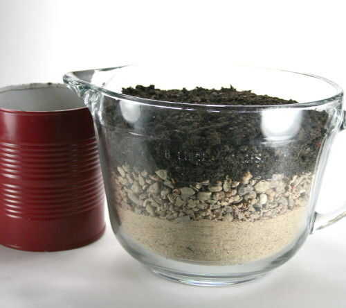 Toma un recipiente (lata en mi caso) y se llenan de arena. Verter en un cubo grande. Repita para la grava y compost utilizando el mismo recipiente.