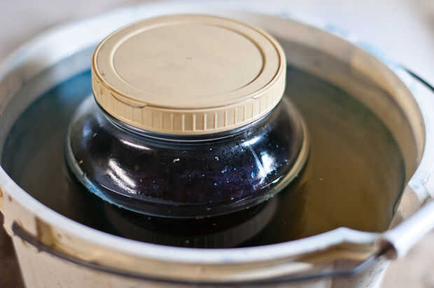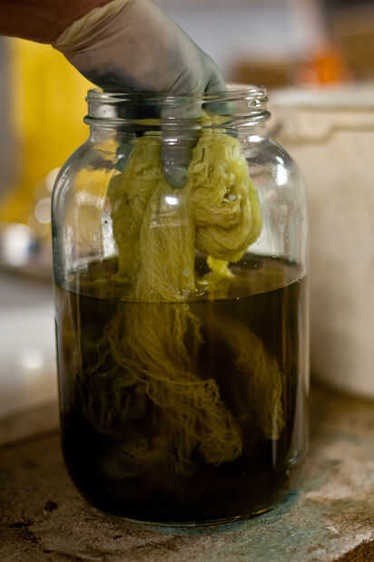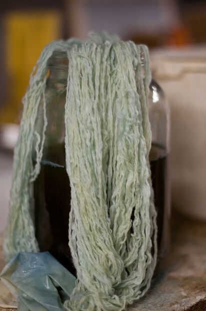 Porque tenía que ir a trabajar, dormir y comer, y todas esas cosas buenas, mi baño de tinte enfriado en el garaje por un par de días. Para el mejor morir necesita el baño caliente. Para eso puse el frasco en un balde de agua caliente. Sólo tomó sobre una media hora para llegar a la temperatura, unos 90-100 grados. Después de la desoxidación el líquido se convierte en amarillo. Sumergió el hilado en el baño y sale amarillo. Como el hilo de golpe el aire, la oxidación comenzó inmediatamente a verde y luego azul.