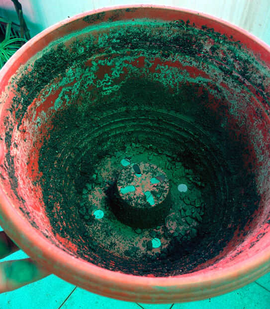 2. Una cesta colgante de plástico con mecanismo de suspensión. tengo un 8" de ancho y 6" profunda cesta. Perdón por la imagen sucia, utilicé la cesta en la que yo había plantado algunas plantas de temporada.