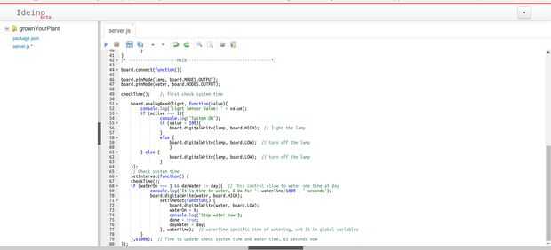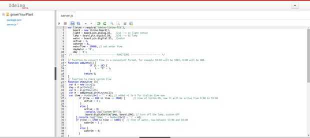{"name": "Ideino Project", "version": "0.0.1", "description": "Ideino example project", "author": { "name": "Ideino Team" } } Server.js y eso es todo! Leemos comentarios en el código para saber qué cambiar para adaptar el sistema a las necesidades de su planta.