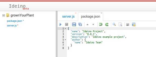 Cree un nuevo proyecto en el IDE Ideino, elija nombre y modificar los archivos package.json y server.js como sigue:
