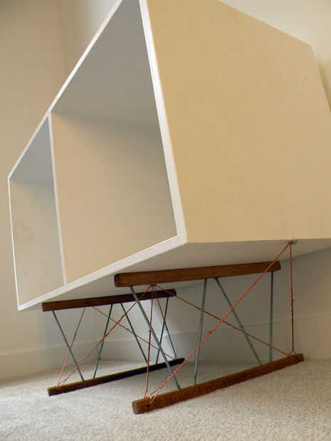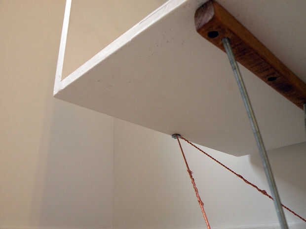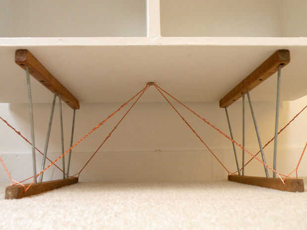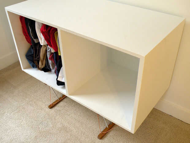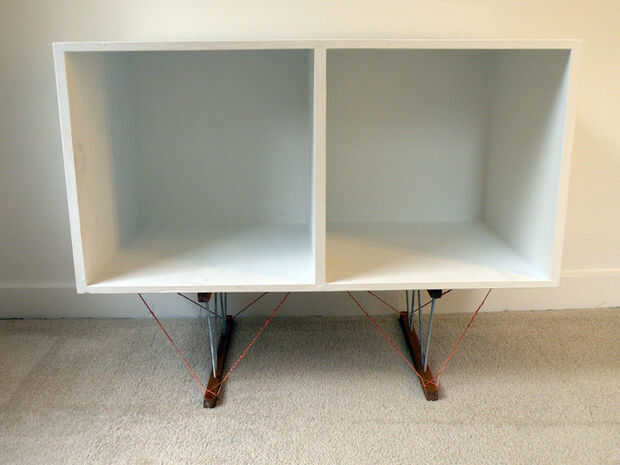 Las piernas son pequeñas armaduras hechas de varillas roscadas y restos de madera, sujeta con alambres de individuo. Son baratos, ligeros, desmontables y agregar una dulce mirada moderna. De altura de pie, los cubos parecen flotar como las piernas desaparecen por debajo.