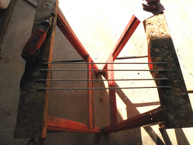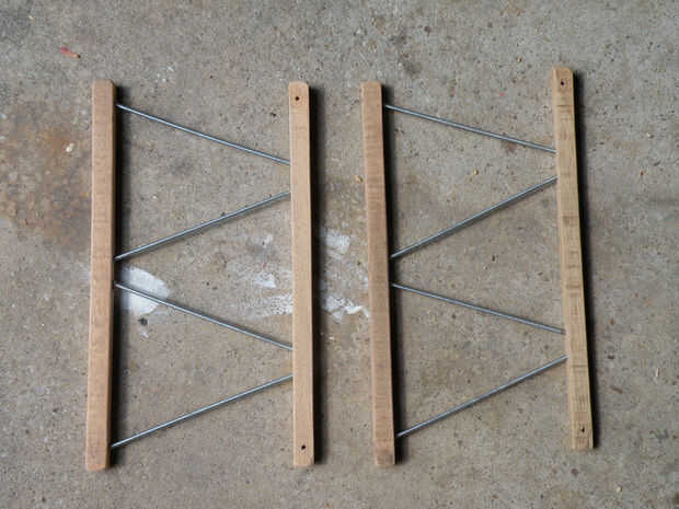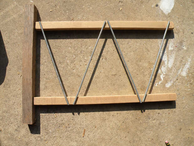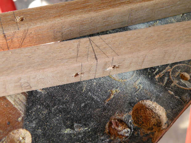 Poner los pedazos de la barra otra vez, en todas las marcas, para obtener el ángulo para piezas de varilla. Trazar las barras para obtener los ángulos ásperos. Usando una broca ligeramente más pequeño que el diámetro de las barras, perfore cuatro agujeros angulares a través de la profundidad de la madera en cada pieza.