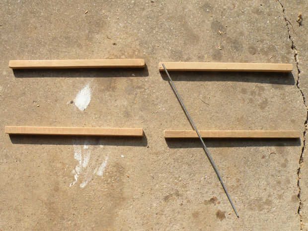 Ahora debe haber cuatro marcas de hash de cada pieza de madera. Colocar la varilla roscada en la parte superior la madera, alineados con sus marcas, para obtener una longitud aproximada de las piezas de la barra. Haga una marca en la varilla. Cortar ocho a esa dimensión.