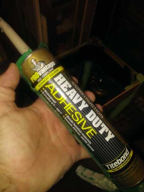 2) utilizando el adhesivo de construcción aplique alrededor de los bordes de la parte superior desnuda de la tabla.