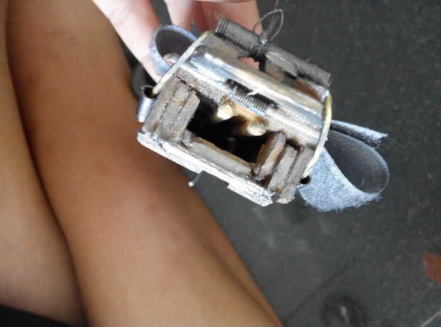 Paso 1: Las herramientas1 x cajón diapositiva correas de 2-3 x o tiras de Velcro cortador de metal Dremel martillo imaginaciónPaso 2: Una instalación necesaria Cortar la diapositiva del cajón donde cabe cómodamente en el antebrazo. Asegúrese de hacer