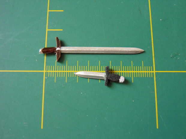 Aunque raramente ve Ezio Auditore con armas además de sus espadas ocultas, sentí que tenía que darle algún tipo de arma (él es un asesino, después de todo). Así que hice una espada y una daga. Utilicé las hojas de las espadas de cocteles para las palas, pintura plata con un marcador plateado. Para hacer las empuñaduras usé gomaespuma negra y marrón.