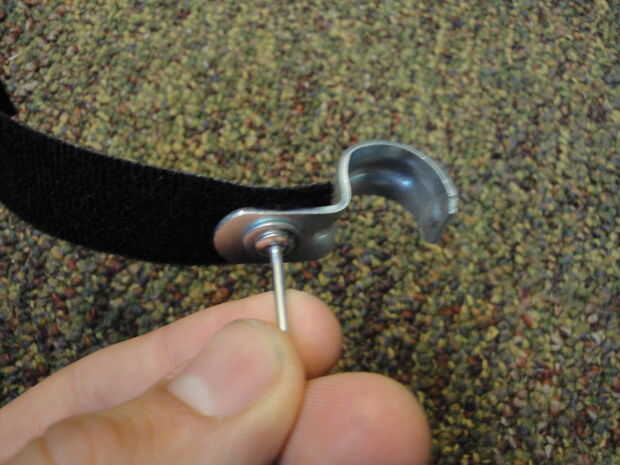 Para hacer una sola correa (una vez más, usted estará haciendo cuatro), necesita la correa de Velcro, una abrazadera, dos arandelas y un solo remache.