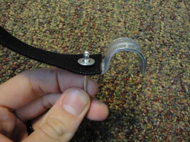 Coloque una arandela sobre el remache y luego deslice el extremo del remache a través del agujero y correa desde la parte inferior (otra vez, vea el cuadro).