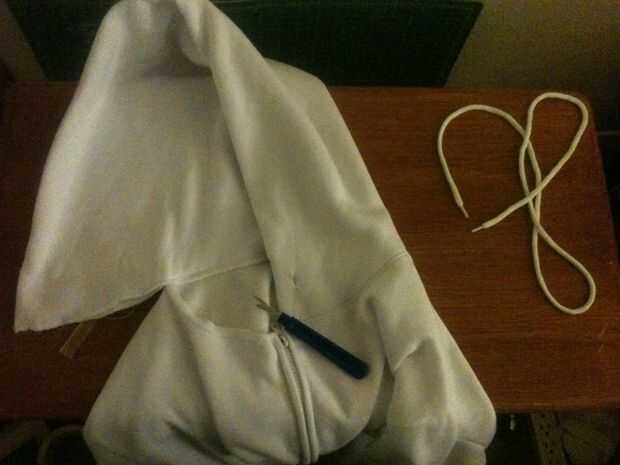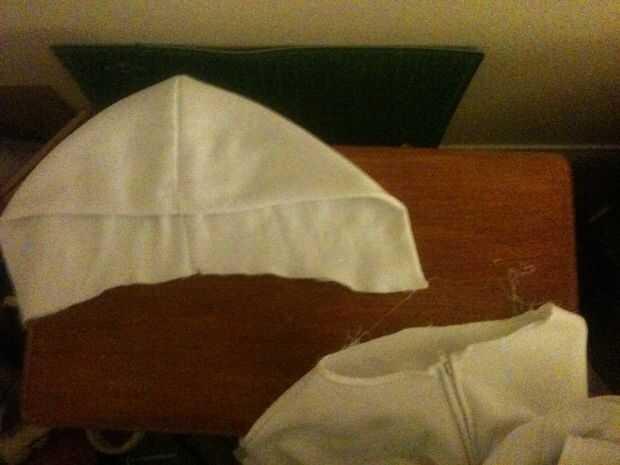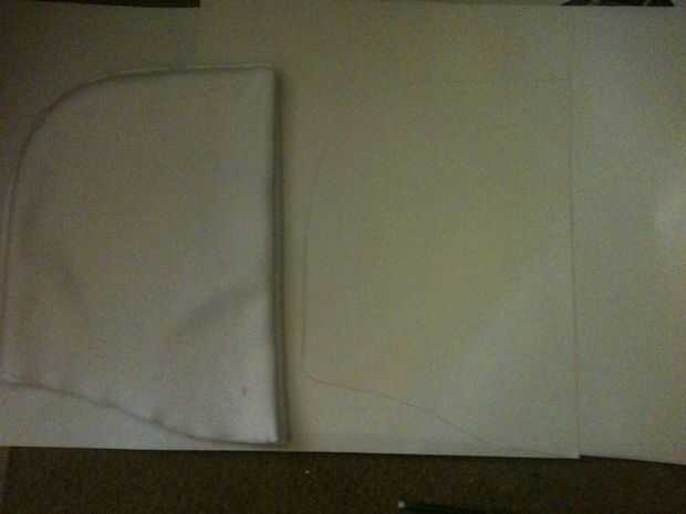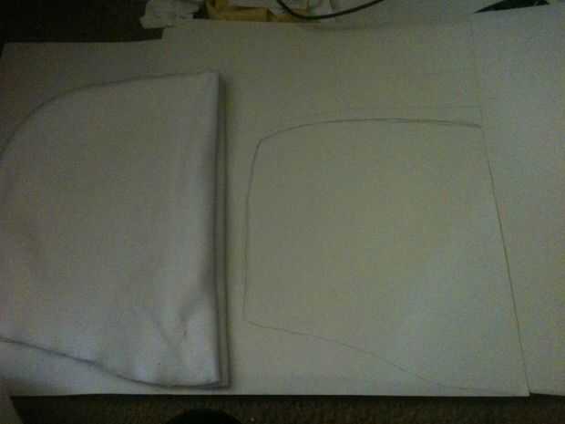 Gire la visera de adentro hacia fuera (por lo que sobresalen las costuras) y dóblalo por la mitad. Establecidas en una hoja grande de papel y trace una línea alrededor de los bordes. Este es el patrón de la capucha básica que modificaremos. En su trazado, medida 9" hasta el borde posterior de la parte inferior y dejará una marca. Ir a la vanguardia y marca 12 1/2" hacia arriba desde la parte inferior. Conectar las marcas con una línea que se curva suavemente en la parte trasera y se endereza hacia fuera hacia el frente. Recortar esta forma como el patrón de los lados de la campana de asesino.