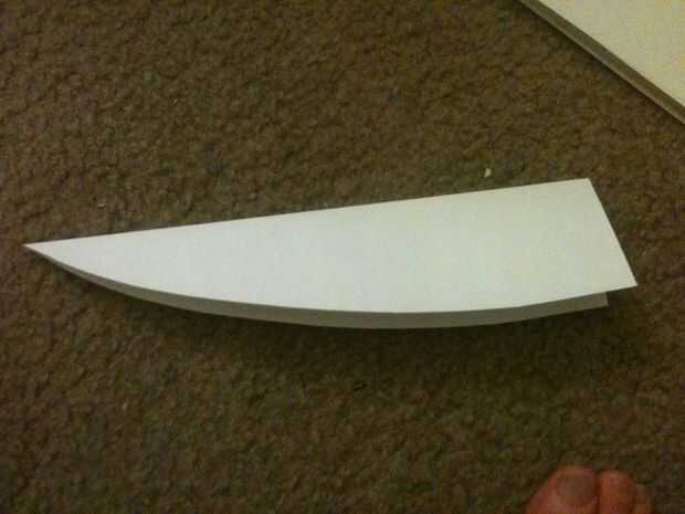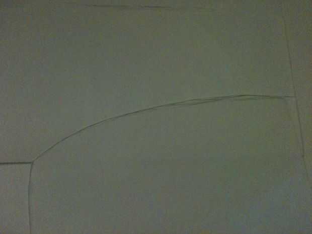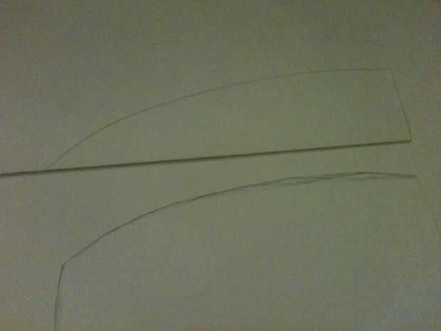 La pieza siguiente que veremos es el panel que se encuentra arriba de la cabeza. Este panel sigue la misma curva que hace en la pieza anterior del patrón. Doble un pedazo de papel por la mitad y marque 2 1/2" de la tapa. Coloque el panel anterior de la plantilla encima de este papel doblado. Alinee la esquina superior frontal de este modelo a la marca hecha en la hoja plegada, dos y media pulgadas desde el pliegue. Al mismo tiempo, coloque la parte superior posterior del plegamiento. Trazar la curva que estableció anteriormente en el papel doblado. Cortar el papel doblado a lo largo de esta línea y abrir para crear una forma simétrica.
