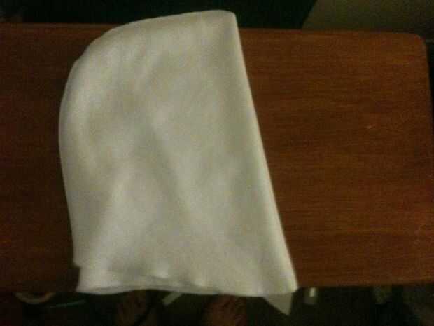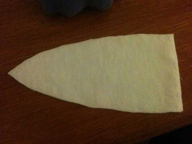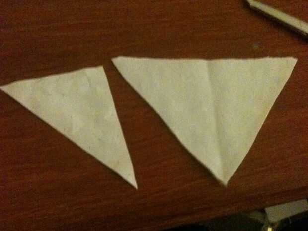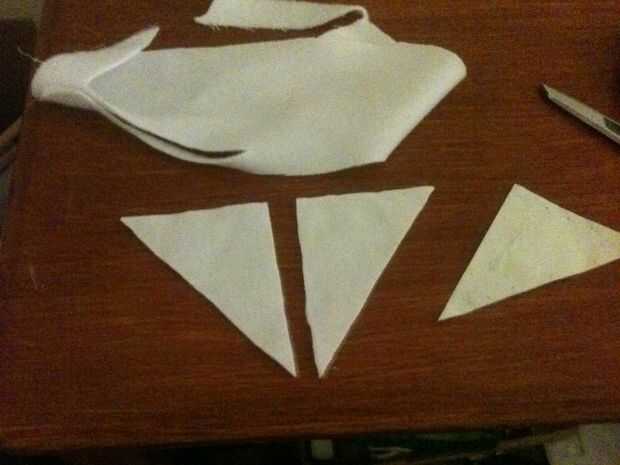 Siga el mismo procedimiento de fijación y corte con su triángulo de papel. El pico se compone de cuatro de estos paneles triangulares, dos de ellos una imagen de espejo de los otros dos. Sólo dos de estas le mostrará, así que si usted tiene suficiente tela sobrada podría cortar solamente dos de estos triángulos de la derecha y el panel de un triángulo isósceles que es el equivalente de dos de los triángulos de patrón espalda con espalda.