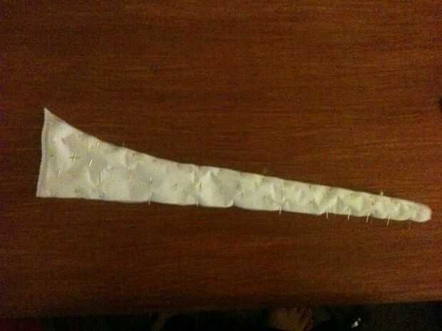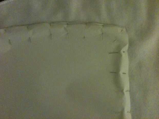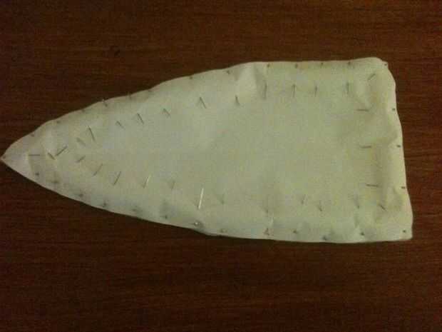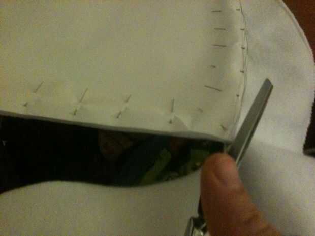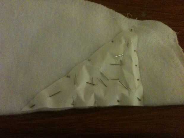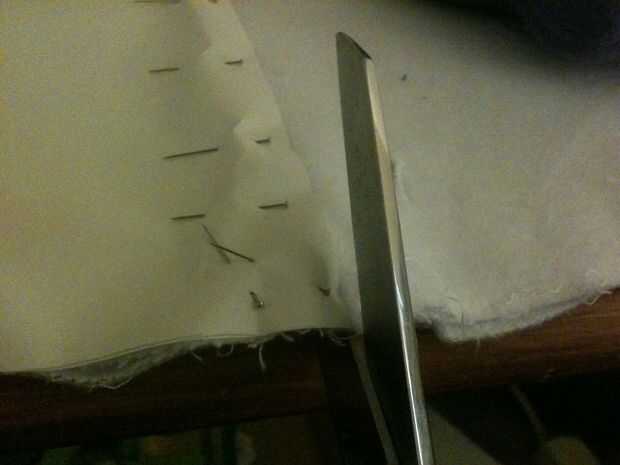 Establecer su patrón de panel lateral en el borde del material, adecuación a la forma de la campana que ha derivado. Querremos una costura por el borde posterior de la campana de todos modos, así que podemos salvarnos a nosotros mismos algunos problemas y utilizar el ya allí. Fije el patrón hacia abajo con los pernos, penetrar el papel y dos capas de tela. Utilizar un montón de clavijas para asegurarse de que no una pulgada de material cambia mientras que usted está cortando. Empuje las cabezas de los pernos en para asegurarse de que no hay pernos de cruzan sobre el borde del papel.
