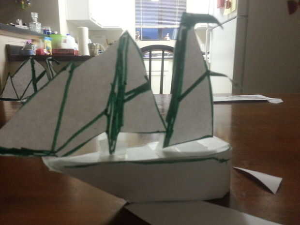 Dibuja las velas en el papel, luego cortar las velas hacia fuera y finalmente cinta las velas sobre el cuerpo de la Goleta, y listo!