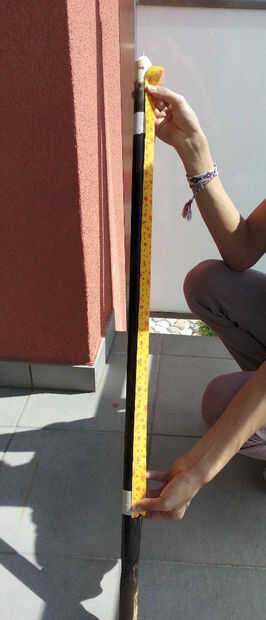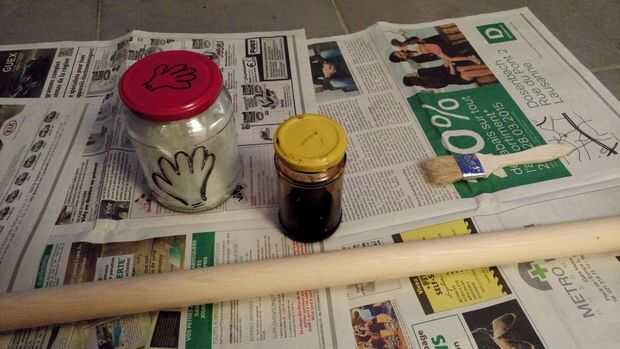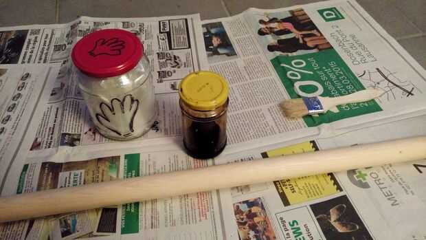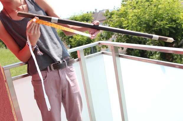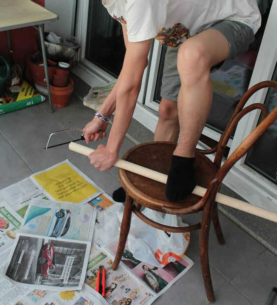 1. Comience por marcar cuatro puntos en el palillo de madera de un extremo a 22cm, 45cm, 68cm y un último en 91 cm. (como puede ver que hemos utilizado cinta adhesiva para ello que es muy práctico!)