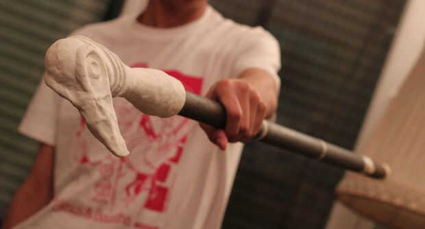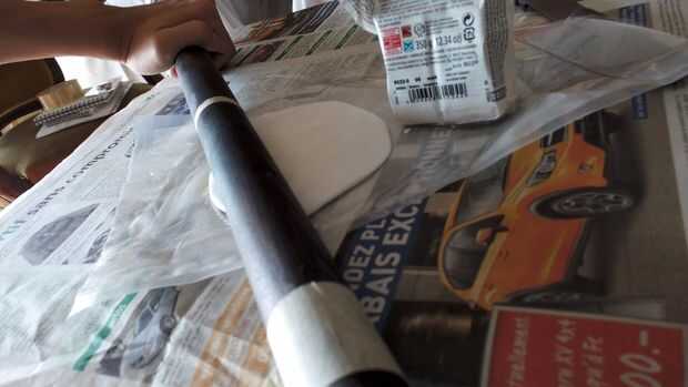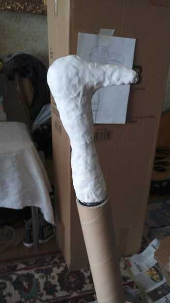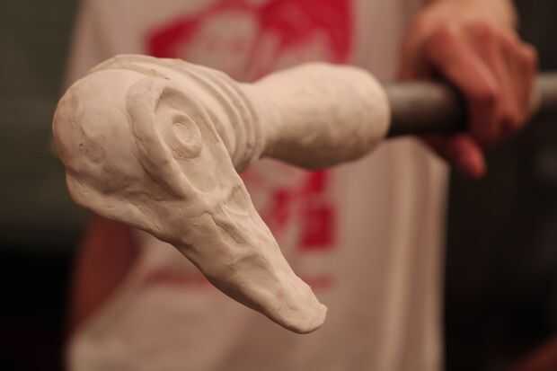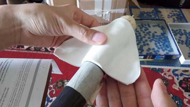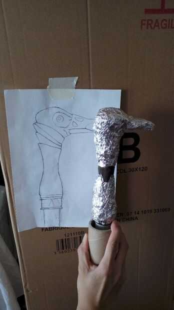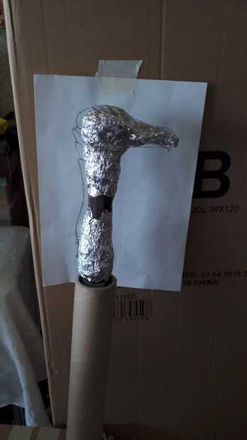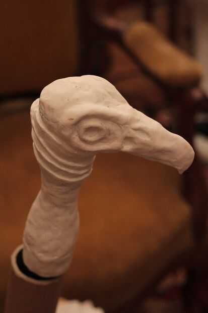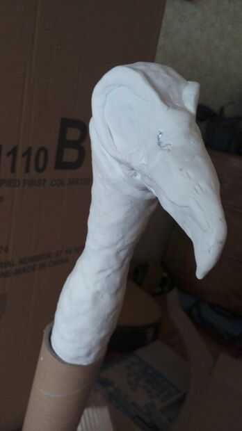 Envuelva la parte superior de la caña con papel de aluminio y hacer una forma básica de la cabeza del águila una bola del tamaño de un huevo con la arcilla aplane la bola aplicar sobre el papel de aluminio y comenzar a esculpir el águila hacia fuera.