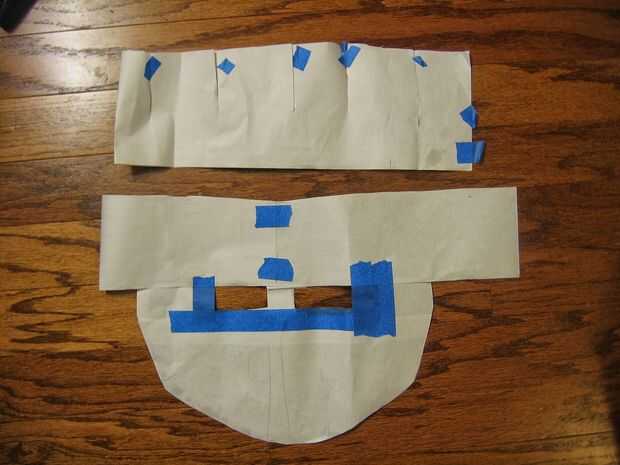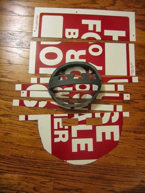He transferido mi dibujo a papel y utiliza mi cabeza como una referencia para recortar el patrón de papel a forma. Puesto que el plástico es delgado, no preocuparse espesor del material en la transferencia del papel al plástico. Después de unas pocas iteraciones, tenía un papel que se ajustan alrededor de mi cabeza y la venda del patrón. Preste especial atención a las aberturas del ojo. Mientras que la visión se redujo, desea que la posición para maximizar lo poco que puedes ver. El patrón consiste en las porciones superiores e inferiores del casco. No patrón de cualquiera de las bandas o la parte trasera inferior del casco.