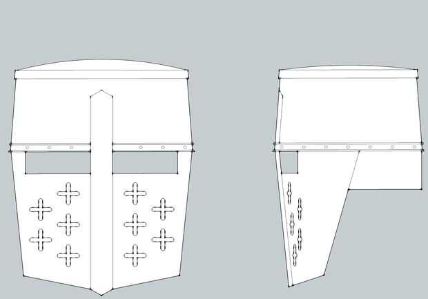 Usando varios cuadros de referencia, crea un dibujo en Google Sketchup. Antes de que transferí el dibujo al papel, solía espuma EVA para crear una venda. Medir la circunferencia de la cabeza, utiliza las tiras con borde de la estera para la banda. No hacer la venda demasiado apretada. Se proporcionan comodidad y sirven para mantener el casco en su lugar. También he añadido una tira de delante hacia atrás ponga el casco verticalmente.