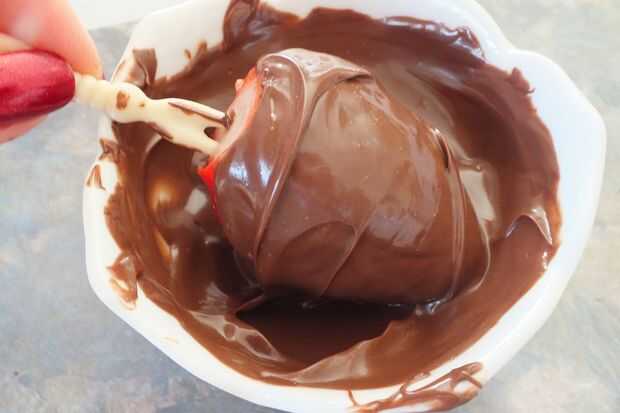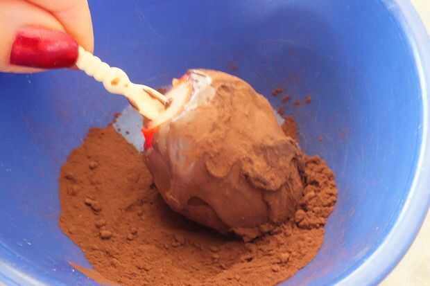 Pinchar al final de cada fresa y sumergir la fresa todo el chocolate.